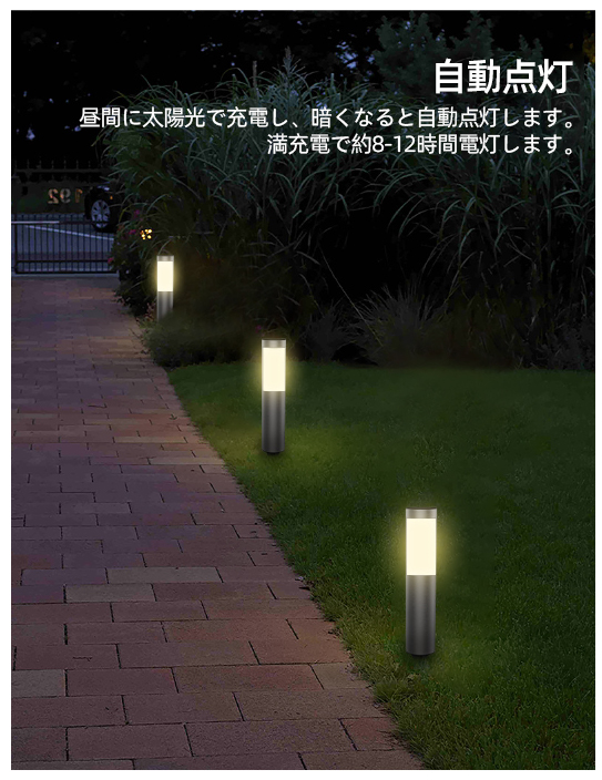 長時間照明 ソーラーライトは長持ち性、耐久性の高いソーラーパネルを使用しています。太陽光発電なので、昼間にソーラーエネルギで自動充電し、太陽エネルギーを電気に変換します。配線の必要はありません。地震や台風などの災害による停電でも、庭や小道を照らして飾ることができます。6~8時間の光の後、それは8~10時間夜に働くことができます。