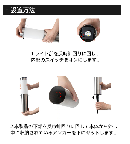 工事不要 ◎地面に埋め込むだけで設置でき、ソーラー発電で電気代不要!◎お庭や玄関先などに最適なLEDソーラーライト。地面に差すだけとセッティングもカンタン。お手軽カンタンに、自宅のお庭を彩ります。付属品のアンカーを地中に埋め込んで固定し、玄関までの通路や庭先までのアプローチ部分にやさしい明かりを点灯します。